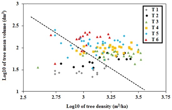 Figure 4. Average volume of trees (Log10 dm3) based on their total density (Log10 m2/ha) in the six structural types (from T1 to T6). The dotted line represents the minimum threshold for natural black-spruce forest canopy closure suggested by Newton [61]. Forest stands to the right are considered as closed stands, while stands to the left are considered as open stands.
