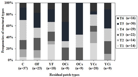 Figure 5. Stacked bars representing the frequencies of structural types (T1–T6) in each residual patch type and continuous forest stand. Young cut clump (YCc); young cut island (YCi), and young fire (YF): EXT: 0–19 years; old cut island (OCi), old cut separator (OCs), and old fire (OF): EXT ≥20 years and continuous forest (C): Control.