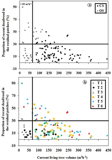 Figure 6. Relationship between the proportion of recent deadwood volume (%) and the current living wood volume (m3/ha) in the residual patches and continuous forest stands in terms of (a) canopy closure and (b) structural diameter types. The proportion of the recent deadwood volume is the ratio of the recent deadwood volume on the initial stand volume before disturbance. The initial stand volume (ISV) at the time of the formation of each residual patch is estimated as the sum of current living volume and recent deadwood volume.