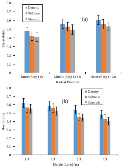 Trends in heritability from pith to bark and along the stem height were also investigated for wood density, MoE and MoR (Figure 1). The results show that the heritability for wood density, MoE and MoR increased from pith to bark and decreased from the butt upwards. This suggests that efficiency of selection based on the outer wood for wood density, MoE and MoR would generally be higher than selection based on inner wood. The heritability ranged from 0.409 ± 0.048 (MoR) to 0.606 ± 0.052 (wood density) along the radial direction and 0.619 ± 0.055 (wood density) to 0.405 ± 0.047 (MoR) along the stem height. This indicates that the traits (wood density, MoE and MoR) are under moderate to high genetic control along the radial direction and stem height. Therefore, genetic progress can be achieved through indirect selection of these wood properties (wood density, MoR and MoR). The present results are consistent with the findings of other researchers [24,25,26,27] in different species.