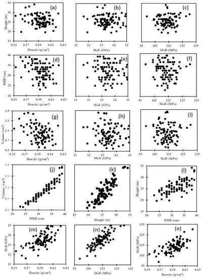 Phenotypic relationship between growth traits and wood properties (a–i); among growth traits (j–l); and among wood properties (m–o).