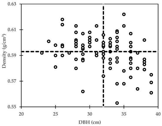 The adverse genetic correlations between wood properties and growth traits were moderate. This suggests that there may be some genotypes with both high growth performance and high wood density, stiffness and strength. Therefore, the adverse genetic correlation between wood properties and growth traits may not entirely prohibit the improvements of both wood quality and growth traits [41]. In the short term, it is possible to achieve significant gains in both density and DBH by selecting families or individuals from the top right quadrant (individuals with both high wood density and DBH) (Figure 3). Therefore, all trees with both DBH greater than 32.0 cm and density greater than 0.593 g/cm3 must be selected in order to increase the efficiency of the breeding programme. This will result in simultaneous increases in wood stiffness, strength and volume. On the other hand, a long-term strategy would require a larger sample data set to develop a multiple-trait selection index. It is recommended that a multiple-trait selection index should be developed using optimal index weights for the advanced breeding programme of Pinus kesiya in Malawi.