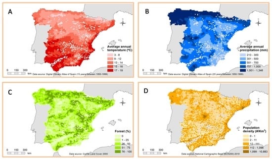 - Ninyerola, M.; Pons, X.; Roure, J. Atlas Climático Digital de la Península Ibérica. Metodología y Aplicaciones en Bioclimatología y Geobotánica; Universitat Autònoma de Barcelona: Bellaterra, Spain, 2005. [Google Scholar]