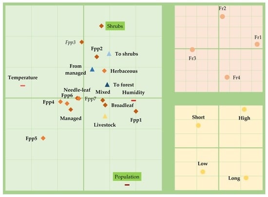 - Dray, S.; Choler, P.; Dolédec, S.; Peres-Neto, P.R.; Thuiller, W.; Pavoine, S.; ter Braak, C.J.F. Combining the fourth-corner and the RLQ methods for assessing trait responses to environmental variation. Ecology 2013, 95, 14–21. [Google Scholar] [CrossRef]