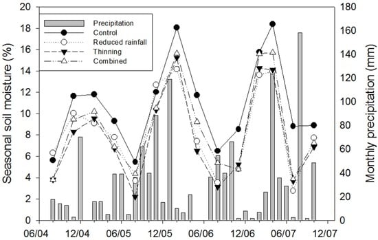 The average temperature showed no significant difference between treatments (Table 1). The seasonal course of soil temperature was pronounced in our study site. The highest recorded Ts was 32.2 °C in summer 2005 and the lowest was −0.3 °C in winter 2005. Soil moisture varied largely over the study period, ranging from 2.3% to 18.4% (Figure 1). Mean annual precipitation was lowest in 2006 (400 mm) and highest in 2007 (830 mm). The highest soil moisture occurred in winter and spring, but then dropped sharply in summer. The lowest soil moisture (2.3%) was recorded during the thinning treatment in summer 2005. Soil moisture was correlated negatively with Ts; the peak of Ts in summer coincided with the lowest soil moisture values. Throughout the four monitored years, the mean seasonal soil moisture in the control treatment was consistently higher than in the other treatments. Despite the reduced rainfall treatment, we did not find lower soil moisture in the plots subjected to reduced rainfall during most of the measurement campaigns.