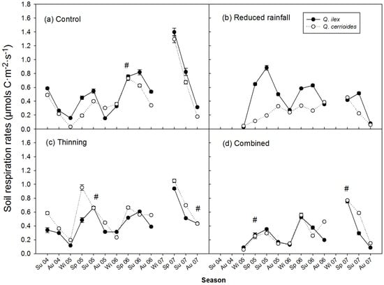 Seasonal variation in soil respiration of Q. ilex and Q. cerrioides for each treatment: (a) control; (b) reduced rainfall; (c) thinning; (d) combined treatment. Reduced rainfall treatment was installed at the end of 2004, therefore, the data for reduced rainfall and the combined treatments started in 2005. Data represent seasonal means with SE. Differences in SR between species were statistically significant except when marked with # (p > 0.05).