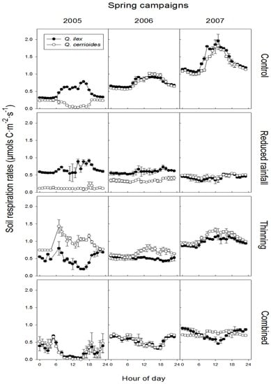 We also compared the diurnal variation in SR under the two tree species during spring and summer campaigns (Figure 3 and Figure 4). During the spring campaigns, SR under both tree species in the control treatment showed a clear diurnal pattern, except for SR under Q. cerrioides in spring 2005. Meanwhile, in the reduced rainfall treatment, the diurnal changes of SR almost diminished. In the thinning treatment, SR under Q. ilex in 2005 showed a reversed diurnal pattern, but in the following two years the patterns turned back to be flat. The diurnal patterns of SR under Q. cerrioides in the thinning treatment were similar to the patterns in the control treatment, but with limited range and a clear depressed SR at noon. In the combined treatment, SR under both Q. ilex and Q. cerrioides showed a significant reduction during the day in 2005, but the reduction decreased in the following years. The diurnal variation of SR during summer campaigns was slightly different compared to spring. In the control treatment, although SR under the two tree species showed similar daily patterns, the variation of SR under Q. ilex was much higher than SR under Q. cerrioides. In the reduced rainfall treatment, SR under Q. ilex still exhibited a clear diurnal change, while SR under Q. cerrioides was almost steady. In both thinning and combined treatments, SR under two tree species showed a pronounced reduction during the day.