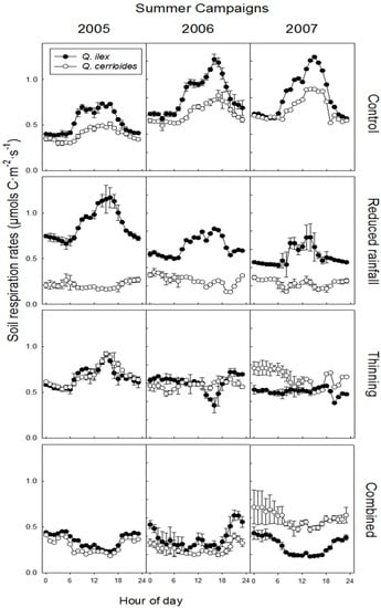 Diurnal variation of soil respiration rates (SR) with standard errors under Q. ilex and Q. cerrioides during summer in 2005, 2006, and 2007 (from left to right) and for each treatment: control, reduced rainfall, thinning, and combined treatment (from up to down). Shown are hourly rates of SR averaged over each campaign.