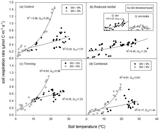 The apparent soil Q10 was affected significantly by soil moisture. However, this soil moisture threshold is not applicable to the relationship between SR and Ts in the reduced rainfall treatment. In the reduced rainfall treatment, we observed some campaigns with soil moisture higher than 8%, but SR of these campaigns were still lower than the SR in the control treatment of the same campaigns. The reduction of Q10 due to drought has been found in many studies [,,,]. As the apparent Q10 in this study was calculated as annual Q10, the low Q10 in the reduced rainfall treatment could be attributed by the diminished seasonal amplitude of SR, especially SR under Q. cerrioides. We found relatively few studies on the response of Q10 to forest management. At our study site, we found Q10 did not vary in response to thinning, which is similar to the finding of Tang et al. []. Our result is also consistent with Pang et al. [], who showed that thinning increased the seasonal Q10 significantly, but not the yearly Q10. Overall, the different SR-Ts relationship between the reduced rainfall treatment and combined treatment indicated that selective thinning treatment had at least partially mitigated the drought stress by improving the SR in response to environmental change.