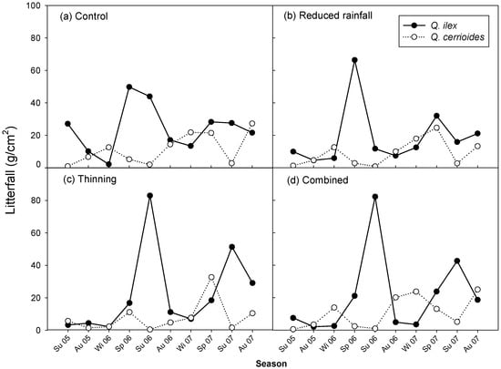 Seasonal variations in litter fall of Q. ilex and Q. cerrioides for each treatment: (a) control; (b) reduced rainfall; (c) thinning; (d) combined treatment. Reduced rainfall treatment was installed at the end of 2004, therefore, the data for reduced rainfall and combined treatments started in 2005.