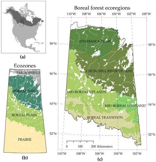 The study area was defined as the Boreal Shield and Boreal Plain ecozones of northern Saskatchewan, Canada (Figure 1). This 361,924 km2 area is bounded in the north by Lake Athabasca, Black Lake, and Wollaston Lake, which delimits the northern limit of boreal forests and the start of taiga forests. Taiga forests were excluded from this study given the smaller size of this ecozone in Saskatchewan and lower amounts of forest cover. The Boreal Plain ecozone represents the southern part of the study area (178,225 km2) where boreal forest transitions to the Prairie ecozone. The area’s largest human imprint is, by far, at this transition (i.e., the Boreal Transition ecoregion) (Figure 1c). Large tracts of land in this area have been converted to agriculture and, given its higher population density than areas to the north, are subject to more intensive fire suppression effort. The Boreal Plain is underlain by sedimentary rock with thick glacial deposits with water bodies being common (8.4% water). Forest exploitation occurs in the Boreal Plain but is relatively minor and is localized. The Boreal Shield ecozone covers the northern parts of the study area (183,699 km2) and is characterized by rolling terrain of Precambrian bedrock (Canadian Shield) with shallow soils derived from thin glacial deposits and numerous water bodies (19.9% of the ecozones is water). There is no forestry in the Boreal Shield. North of the Boreal Transition ecoregion, the anthropogenic impact on fire activity in Saskatchewan is generally considered to be relatively minor, given the extreme nature of fire-conducive weather (i.e., thereby limiting fire suppression effectiveness) and the lack of fire management activities beyond the immediate vicinity of communities [].