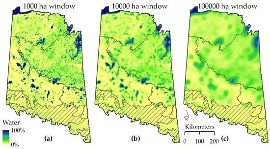 Amount of water in different moving window sizes in the boreal forest of Saskatchewan, Canada. Window sizes include: (a) 1000 ha; (b) 10,000 ha; (c) 100,000 ha. Areas of dark blue represent areas dominated by water, while yellow areas represent areas with very low amounts of surrounding water.