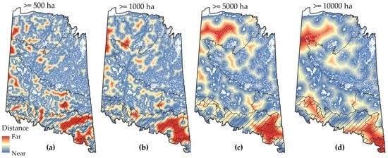 Distance to nearest water body of defined sizes in the boreal forest of Saskatchewan, Canada. Maps represent distance to water at (a) ≥500 ha; (b) ≥1000 ha; (c) ≥5000 ha; (d) ≥10,000 ha. Areas of red are further from water; while areas of blue are close to water (water bodies are white).