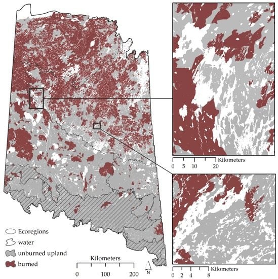 - Larsen, C.P.S. Spatial and temporal variations in boreal forest fire frequency in northern Alberta. J. Biogeogr. 1997, 24, 663–673. [Google Scholar] [CrossRef]