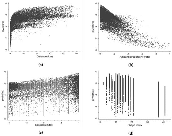 Model predictions of wildfire probability, p(wildfire), at sample locations (25-m pixel) in the Churchill River Upland over a 35-year period (1980–2014) as a function of: (a) distance from lake ≥5000 ha; (b) amount (proportion) of water within 1000 ha; (c) eastness to nearest lake ≥5000 ha (−1 is east side/west bearing to water; +1 is west side/east bearing); and (d) shape of nearest lake ≥5000 ha (larger values are more irregular shaped). Variation in predictions for any one variable represents the effects of other linear and interacting factors.