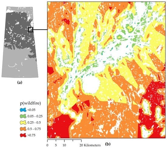 Model predictions of the likelihood of a wildfire, p(wildfire), over a 35 year period (1980–2014) as a function of the presence of islands and the amount of water, distance, direction, and shape of nearest large lake. (a) Map of Saskatchewan indicating location of boreal forests (dark gray) and the location of mapped predictions (small black polygon with leader line); (b) predicted probability of wildfire, p(wildfire), per 35-year period for the area around the southern parts of Reindeer Lake in northeast Saskatchewan, Canada.