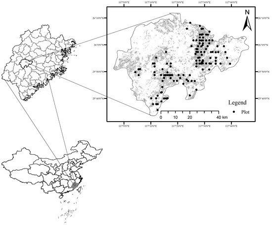 The study was conducted in the Moso bamboo forests (Figure 1, polygons) across Yong’an City, Fujian Province, Southern China (117°56′–117°47′ E, 25°33′–26°12′ N). It has a subtropical southeast monsoon climate with a mean annual temperature of 19.3 °C, while the lowest temperature is −11°C and the highest temperature is 40 °C. The average annual precipitation is about 1600 mm [25,26]. The elevation of the study area ranged from 580 m to 1605 m above sea level [25]. The accumulated temperature of ≥10 °C is 4520–5800 °C, lasting for 225–250 days, and the relative humidity is about 80% [25]. The main soil type is Oxisol. Yong’an City has a forest cover of 82%, including an area of 5.85 × 104 ha of Moso bamboo forests [26]. Moso bamboo forests are mainly distributed below 800 m, most of which are pure stands and sometimes mixed with Keteleeria cyclolepis Flous., Cunninghamia lanceolata (Lamb.) Hook., Myrica rubra (Lour.) S. et Zucc., Choerospondias axillaris (Roxb.) Burtt et Hill., Liriodendron chinense (Roxb.) Burtt et Hill., and Schima Superba Gardn. et Champ., etc. To improve the stand productivity and increase the income, fertilization treatment has been widely applied in most of the Moso bamboo forests. The fertilization treatment was conducted across the whole study area using the same protocol established by the local Forest Bureau. Similar fertilization types—organic fertilizers with N, P, and K addition, were offered every year by the Forest Bureau because the residents can get an economic subsidy if they follow the protocol and use the recommended fertilizers.
