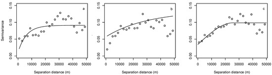 Experimental semivariograms of soil N (a), P (b), and K (c) stocks.