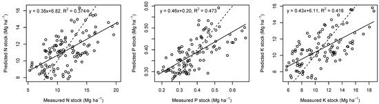 Determination coefficients ranged from 0.37 to 0.47 (Figure 3), which may appear relatively low, but they were similar to many previous studies regarding the spatial interpolation of soil properties [47,48]. This problem is associated with the dataset, which was not sampled with a probabilistic design [48]. For example, the majority of sampling plots were allocated in the southern and eastern parts of Yong’an City in the current study (Figure 1). Therefore, a dataset with a probabilistic design is recommended for spatial interpolation of soil properties. Another possible explanation might be the strong local variation of soil N, P, and K stocks caused by the variability in environmental conditions and fertilization practices. On the other hand, the low correlation between the predicted and measured data indicates that a better methodology, such as one using Artificial Neural Network and Random Forest, should be developed to improve the accuracy of spatial interpolation of soil N, P, and K stocks, including consideration of both intrinsic and extrinsic factors.