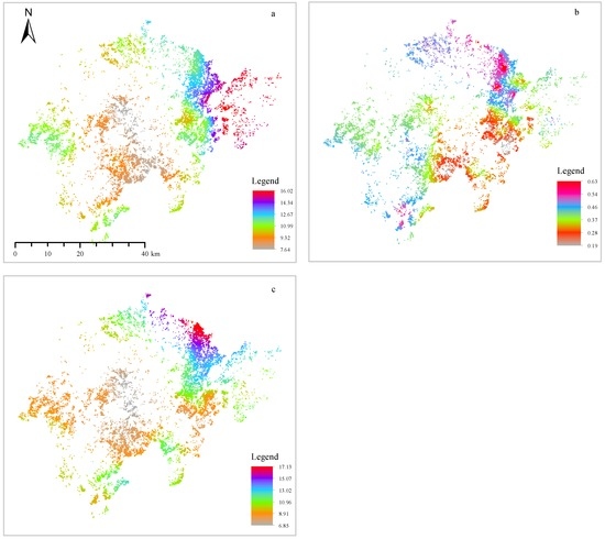 The spatial patterns of soil N, P, and K stocks predicted by OK are shown in Figure 4. Predicted soil N, P, and K stocks ranged from 7.64 Mg ha−1 to 16.02 Mg ha−1, from 0.19 Mg ha−1 to 0.63 Mg ha−1, and from 6.85 Mg ha−1 to 17.13 Mg ha−1, respectively. The lowest soil N, P, and K stocks were found in the middle or southern part of study area, where the city centre was located with a high population, indicating that human activities led to a significant decrease of soil N, P, and K stocks. The highest soil N stock was observed in the east of the study area, the highest soil P stock was found in the southwest and north, and the highest soil K stock was in the north. However, plant growth was constrained by the most limited nutrient. These different spatial distribution patterns suggested that fertilizers with different N:P:K ratios should be applied to maintain and improve the stand productivity. For instance, a relatively lower ratio of P but higher K ratio fertilizer should be applied in the south of the study area (Figure 4b,c), while a relatively lower ratio of N fertilization should be implemented in the east (Figure 4a). Further studies are strongly encouraged to study the N:P:K ratio for the whole study area in order to manage Moso bamboo forests scientifically. The total soil N, P, and K stocks of the whole study area were 0.624, 0.020, and 0.583 Tg (1 Tg = 1 × 1012 g), respectively, indicating soils were important pools of soil N, P, and K.
