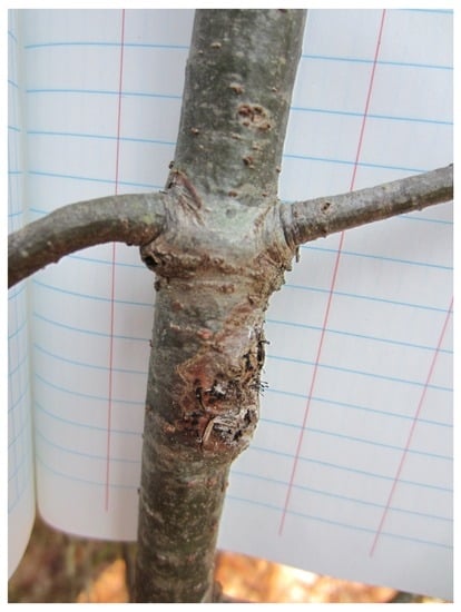- Munck, I.A.; Livingston, W.; Lombard, K.; Luther, T.; Ostrofsky, W.D.; Weimer, J.; Wyka, S.; Broders, K. Extent and severity of caliciopsis canker in New England, USA: An emerging disease of eastern white pine (Pinus strobus L.). Forests 2015, 6, 4360–4373. [Google Scholar] [CrossRef]