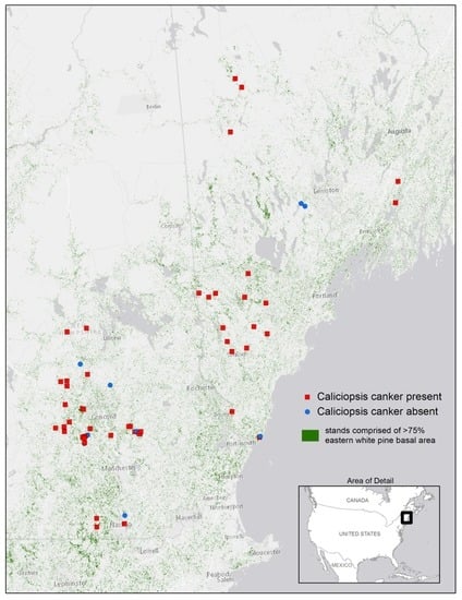 Caliciopsis pinea Peck is a fungal pathogen that causes cankers to pine and other conifer hosts in North America and Europe []. In eastern North America, C. pinea frequently causes damage to eastern white pine [,]. Reports of Caliciopsis canker were frequent during the 1930s [,], but since then, the disease has been mostly overlooked until more recent reports of unexpected damage by this disease [,,]. Concern over loss of value to eastern white pine led to a 2014 survey of randomly selected sites throughout Maine, Massachusetts, and New Hampshire—states with the greatest concentration of white pine in New England [,]. Results from that initial survey indicated that soil group and stand density were promising, predictive factors of the probability of a site having symptoms associated with Caliciopsis canker []. In that study, Caliciopsis canker symptoms were more frequently observed on trees growing in excessively drained (86%) or poorly drained soils (78%) than in well drained more fertile soils (59%) (p = 0.1). Stand density was greater for stands with Caliciopsis than for stands without Caliciopsis (p = 0.1). The relationship between presence of Caliciopsis canker symptoms and soil or stand density, however, was not statistically significant at p = 0.05. In addition, stand density measurements in that study were limited. The objective of this study, therefore, was to further explore the relationship between Caliciopsis canker symptoms and soil or tree density in eastern white pine stands. We hypothesize that eastern white pine growing in more productive soils with adequate soil moisture are less likely to have Caliciopsis canker symptoms than trees growing in nutrient poor, excessively drained, and poorly drained soils. We also hypothesize that incidence of Caliciopsis canker symptoms will increase with increasing stand density.