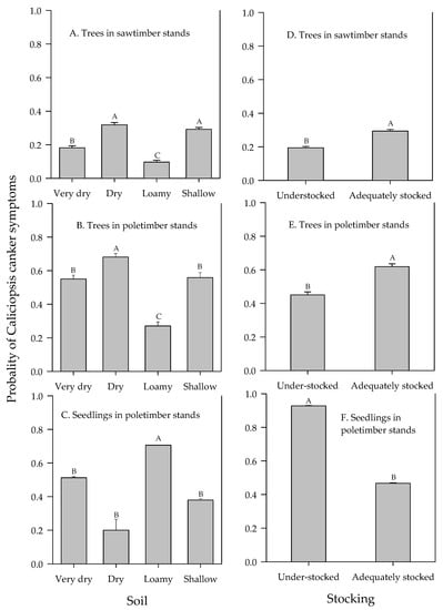 The proportion of trees (DBH > 11.5 cm) or seedlings (DBH < 2.54 cm, height > 30 cm) with symptoms associated with Caliciopsis canker differed significantly across soil groups (p < 0.0001) and stocking categories (Table 2, Figure 3). Trees in poletimber stands were more likely to have Caliciopsis canker symptoms than trees in sawtimber stands. For example, the probability (ranging from 0 to 1) of having Caliciopsis canker symptoms was 0.7 for trees in poletimber stands in the dry soil group compared to 0.3 for trees in poletimber stands in the dry soil group.