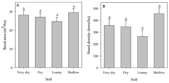 Relationship between soil group and stand density expressed as: (A) basal area per hectare; or (B) trees per hectare, for P. strobus trees sampled in New Hampshire and Maine during 2015–2016. Values with the same letter within each graph are not statistically different (α = 0.05).