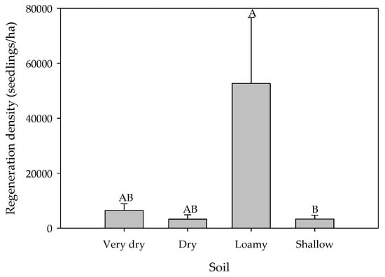 In contrast to results from the tree density analyses, seedling density of seedling in poletimber stands was related to soil type (p = 0.0239, F-value = 3.49, df = 3, 42). Seedling density was greater in poletimber stands on loamy soils than those on shallow soils (Figure 5).