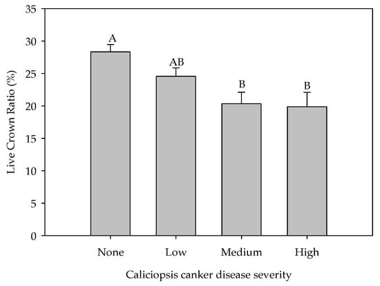 Live crown ratio of eastern white pines in relation to Caliciopsis canker symptom severity for trees sampled in Maine and New Hampshire in 2015–2016. Values with the same letter are not statistically different (α = 0.05).