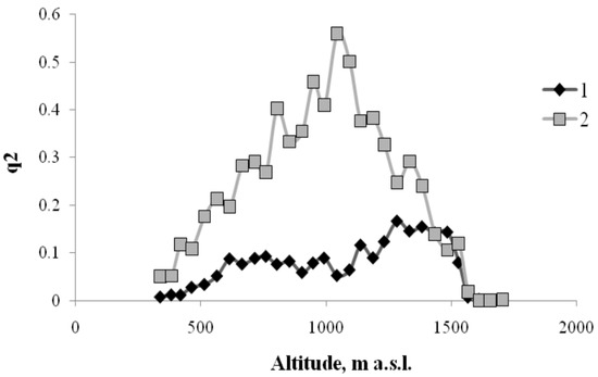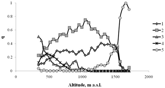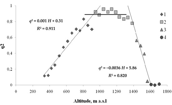 From Figure 5 we can see that hardwood trees occur up to a certain critical height, and, then, conifers completely replace them. From the regression equation for the relationship between q2 and H shown in Figure 5, we can obtain the critical height at which the coniferous tree belt begins.