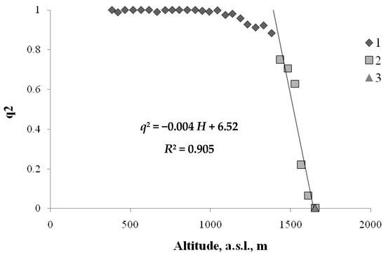 As shown in Figure 4, below ~1500 m a.s.l., the transect area is almost completely occupied by woody plants (i.e., q ≈ 1 and, hence, q2 ≈ 1). From the critical height, ~1500 m a.s.l., upwards, the squared area occupied by plants monotonically decreases, and at a height of about 1700 m a.s.l., there are almost no woody plants, and this is the boundary of the mountain meadow. The form of the regression equation describing the relationship between q2 and H is similar to the form of theoretical Equation (5). The critical height, Нс, at which the forest is completely replaced by the meadow, is found through the relationship between the regression equation coefficients: 1629 m. The height, Нm, at which meadow vegetation almost completely vanishes, can be found from the condition, i.e., m. Thus, the vertical extent of the forest–meadow ecotone is about 250 m.
