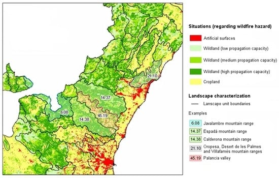 Overlaying the 11 simplified wildfire hazard situations on the landscape unit maps in the atlas of Spanish landscapes confirmed that there is a direct relationship between both maps (Figure 1).