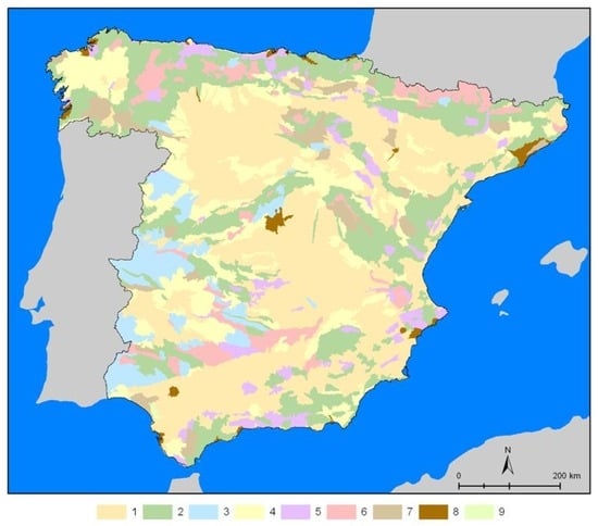 - Mata, R.; Sanz, C.; Gómez, J.; Allende, F.; López, N.; Molina, P.; Galiana, L. Atlas de Los Paisajes de España; Ministerio de Medio Ambiente: Madrid, Spain, 2003.