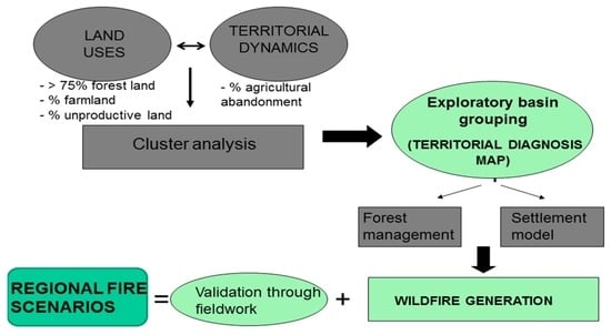 GIS is an essential tool for quantitative and qualitative analysis of land use and territorial dynamics that define fire scenarios [29]. Fire scenarios have been identified and characterized using a GIS-based methodology to perform a spatial analysis of the area attributes of homogenous fire spread patterns on various scales [30]. Cluster analysis techniques have also been used [31] to define exploratory groups of units as the basis of the territorial diagnosis map which allows fire scenarios to be identified at several scales.