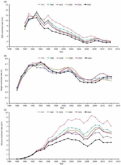 An increase in both DBH and height increment rate was measured between 1988 and 1994 (Figure 2a,b); afterwards, height growth stabilized before declining slightly. We observed a 70% decline in DBH growth between 1994 and 2006; the DBH growth was then approximately 2 mm per year, regardless of plantation spacing. Instead, volume growth rate of individual trees increased linearly from 1988 to 2002 approximately when it reached an asymptote (Figure 2c). The highest growth rate was measured for the 1111 trees/ha spacing and was approximately twice that of the 4444 trees/ha spacing in 2012.