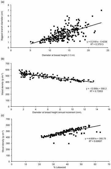 Relationship between diameter at breast height (DBH) and largest branch diameter (a); DBH annual radial increment and wood density (b); and percentage of latewood and wood density (c) for jack pine 25 years following planting in Quebec, Canada.