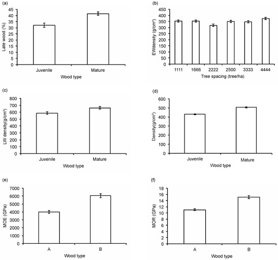 Effect of wood type on percentage of latewood (a); latewood density (c); mean wood density (d); modulus of elasticity (MOE) (e); modulus of rupture (MOR) (f); and effect of tree spacing on the earlywood density of juvenile wood (b) for jack pine 25 years following planting in Quebec, Canada. Data presented are the means (±SE).