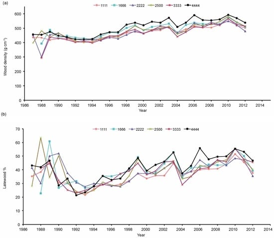 Annual wood density (a) and percentage of latewood (b) at different tree spacing for jack pine 25 years following planting in Quebec, Canada.
