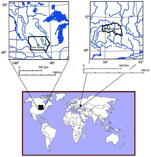 Study areas in the USA and Russia: (1) Iowa River Basin; (2) Vorskla River Basin.