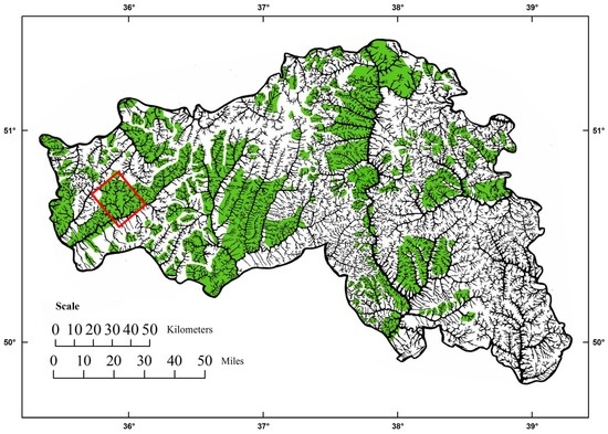 Pre-settlement forest cover (shown in green) in the Belgorod Oblast [41]. The study area is marked by the red rectangle.