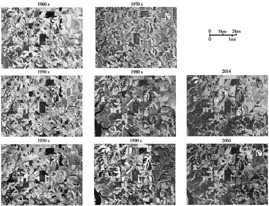 For the Iowa study area, orthophotographs from aerial surveys, as well as satellites were obtained from the Iowa Geographic Map Server [42]. The collection on the server includes black-white aerial photos (from the 1930s to the 1990s) and colored satellite images (since approximately 2000). The highest resolution for all photos is one square meter per pixel. For the current investigation, a resolution of two square meters per pixel was used. Using the aerial photos from the U.S. Department of Agriculture from May 1967–October 1974 (Figure 4), it was shown that afforestation began in the study area in the 1970s [42]. Thus, for the purposes of comparison to current forest cover, we used data starting at 1970. For context, Figure 4 shows the time series of orthophotographs that was used to make this determination.