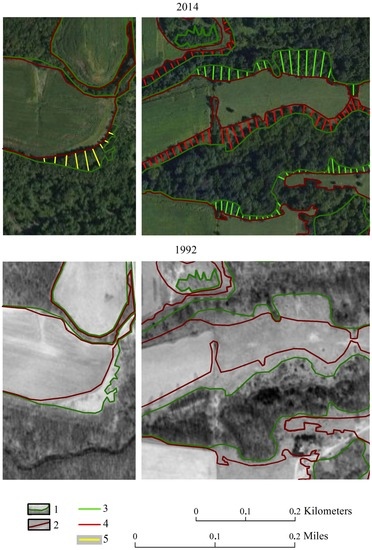 Measurement of forests edges’ frontal advancement (e.g., Iowa study area, 1992–2014). Legend: (1) borders of forest in the orthophotograph from 1992; (2) borders of forest in the orthophotograph of 2014; (3) increments of the forest edge on northern slopes; (4) increments of the forest edge on southern slopes; (5) increments of the forest edge on the watershed.