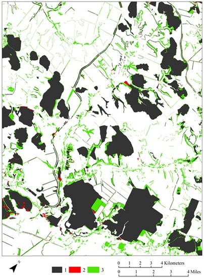 An analysis of aerial photographs, coupled with available information in the literature provided the basis for some explanations pertaining to the relative influence of anthropogenic and natural factors for the increase in forest land cover within the study areas. In some locations, forest-plantations were established, which on the photographs were identified clearly by visible rows of planted trees. The reason for the appearance of forest-plantations and/or abandoned agricultural lands (mainly on slopes) may at least in part be attributed to depletion of soil fertility as a result of erosion on slopes [49]. In some areas, there were changes in the number of forested pixels apparently due to residential construction and/or the planting of trees near new development. This process resulted in a net loss of forested area (see red areas in Figure 6 and Figure 7). In Iowa, the development of a recreation facility on former farm lands in the area of study also resulted in afforestation. An increase in forest land cover near the Coralville Lake shore, after the creation of a reservoir in 1958, was a direct effect of changes in land management (Figure 4). Land was retired from agricultural use and converted into recreational zones, namely the Coralville Lake Wildlife Area [50]. Aerial photography from 1970 showed many open areas that were covered with young trees. At that time, forests covered about 40% of the area within two kilometers of the lake shore just 12 years after the reservoir was created. Forty-four years later (2014), forests covered 80% of that same part of the lake’s shoreline (Figure 6). In the absence of forest plantations in the photography from 1970 and 2014, it is possible to conclude that the change in forest cover was largely due to natural expansion by forest vegetation near the shoreline of the Coralville Lake reservoir (as measured by changes in the number of forested pixels). In Iowa, the process of natural forest expansion into the prairie is confirmed by examining the properties of soils that have clear signs of meadow-steppe soil formation, which at present are situated in forested lands [38]. In a number of locations in Iowa, there are current areas of prairie that were formerly forested during the period of intensive settlement during the second-half of the 19th century [37,51].
