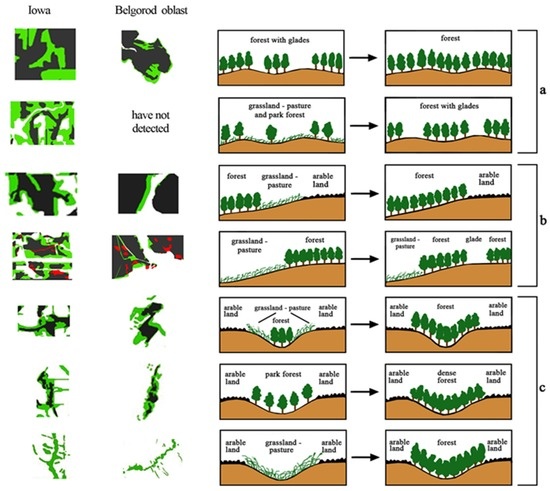 Figure 8 shows land cover in 1970 versus 2014 within the Iowa and Belgorod Oblast study areas. To obtain a subset of information in addition to the earlier articulated methods, land types were divided into three physiographic groups depending on landscape position (Figure 8) as follows: (a) included areas situated on undulating surfaces in the watersheds or on watershed slopes. The typical tendency for this land type was the formation of denser forests replacing sparse forest or individual groups of trees. Group (b) contained plots within the gentler slopes of relatively vast river valleys and big ravines. In this land type, areas of forest advanced in two ways: (1) gradual encroachment upward along slopes (when forest was situated earlier in the floodplain or ravine bottoms); or (2) downward along slopes (when forests contacted underlying along-slope grasslands). In Group (b), haying lands and pastures (grasslands), which in 1970 were transitional zones between forest and arable land areas, were, in the majority of cases, completely afforested by 2014. In these areas, simplified spatial combinations of land management occurred (e.g., previously forest, pasture, arable land or forest, haying, arable land became forest, arable land). However, in some cases, forested area was replaced by hay or pasture lands or the appearance of glades or other open areas (Figure 8b). Group (c) consisted of watershed slopes, combined with relatively small ravines. In these areas, haying lands and pastures within ravines were replaced by forests or dense forests advanced into sparse park-type forests (Figure 8c).