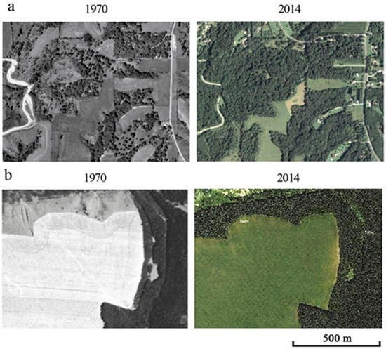 Orthophotographs fragments of surveys from different periods, 1970 (left) and 2014 (right) [42,43,44]; (a) Iowa study area; (b) Belgorod Oblast study area. The appearance of forests took place mostly in ravines and slopes. Outlines of plowed lands remain largely unchanged.