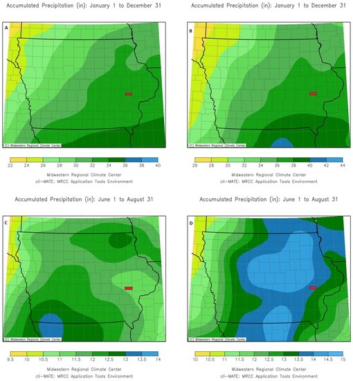 Average values of annual and summer precipitation (in inches) in Iowa during two periods: (A,C) 1931–1960; (B,D) 1981–2010 [45]. The study area is shown by the red rectangle.