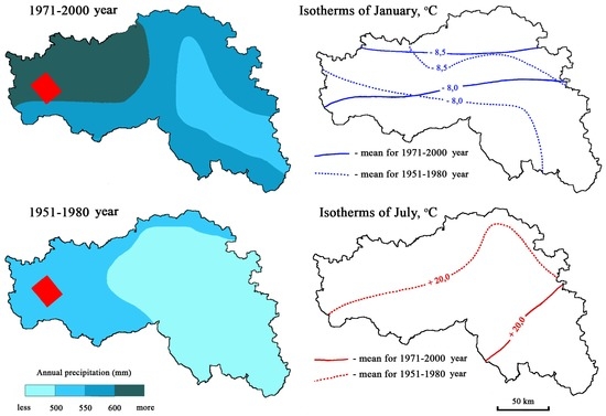 During recent decades in Iowa and the Belgorod Oblast, quantifiable changes in climate (e.g., increased precipitation) have been observed. The comparison of annual and summer season (June–August) only precipitation in Iowa during two periods (1931–1960 and 1981–2010) indicates that by the second-half of the 20th century, the climate of Iowa was more humid, particularly in the summer season. This observation is consistent with many published investigations [15,58,59,60]. In particular, within the study area, the annual precipitation increased by approximately 100 mm (four inches); more than half of this amount during the summer season (Figure 10). Similar climate change was confirmed for the Belgorod Oblast (Figure 11). The comparison of climate maps, which reflect average temperature and precipitation during 1971–2000, with maps of the same variables during the previous thirty-year period (1951–1980), showed that, for the last quarter of the 20th century, there were distinct increases in the annual amount of precipitation. This was reflected by the shift to the north of the January isotherms and to the south of the July isotherms (Figure 11).