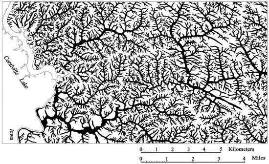 In addition, and in response to climatic changes, natural factors favoring the modern increase in forest cover for Iowa (but also the Belgorod Oblast) include evolving hydrologic erosion networks [8,63,64] with coupled shallow groundwater supplies that are known to support dense riparian forests [61]. Similarly, an additional explanation for forest cover increase is the strongly dissected relief within dense drainage networks, the density of which in some places reaches 5–6 km/km2 in Iowa (Figure 12) and 2–3 km/km2 in Belgorod Oblast (Figure 13). In effect, the slope sections, which obtain additional moisture with surface and subsurface soil drainage, create land forms that are favorable for forest expansion.