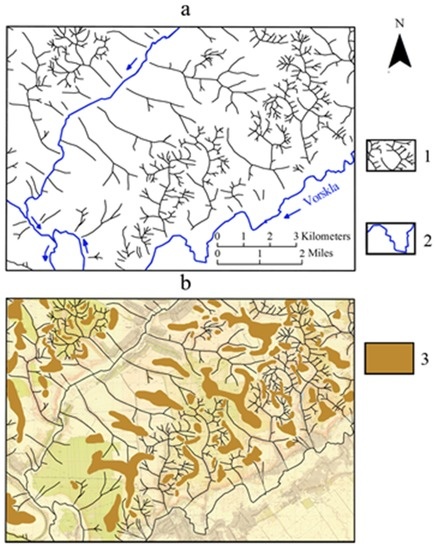 Drainage network in the Belgorod Oblast study area (southern fragment) (a) and flat watersheds distribution (b). Map indexes: (1) bottoms of ravines; (2) rivers; (3) flat watersheds (steepness of surface less than 2°).